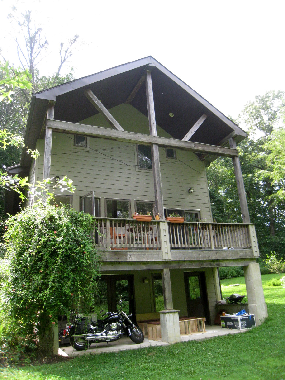 The Bagwell residence includes main living spaces and study and deck on the first floor, three bedrooms and two baths on the second, and a partially finished walkout basement. Designed on a modest budget, this home located in the woods of West Grove, PA features a simple pitched roof with overhangs to provide summer shading while allowing the low winter sun to heat the home.