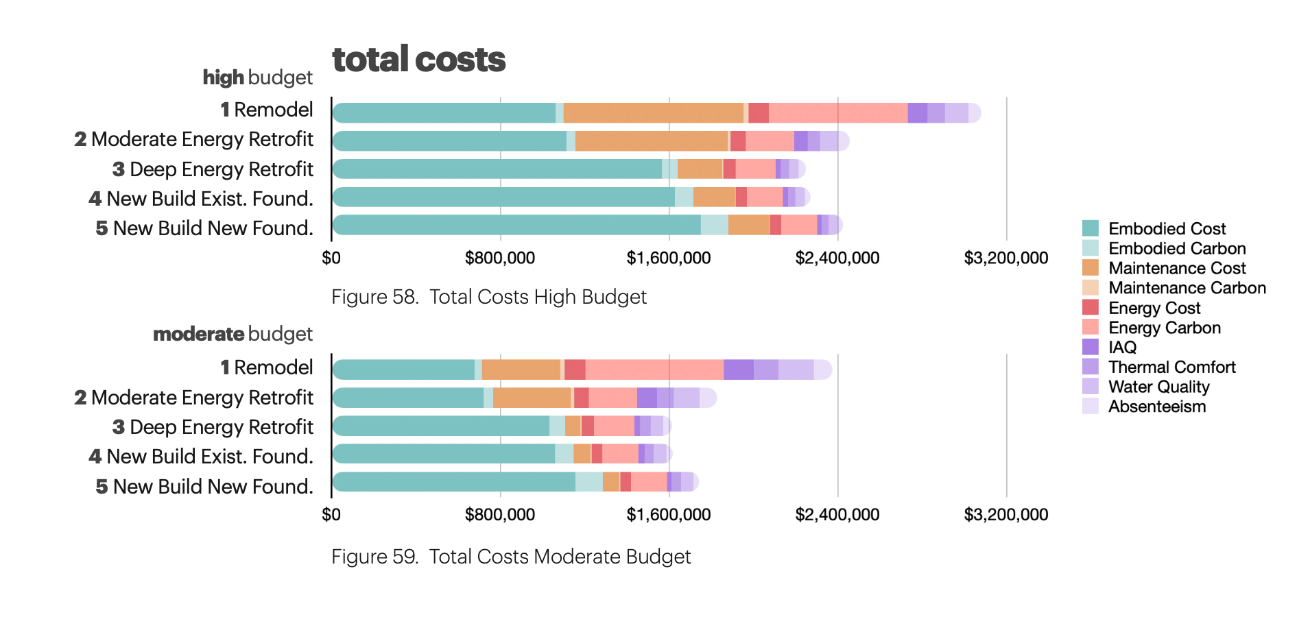 Current life cycle analyses typically conclude their economic assessments in 2050 and favor moderate energy retrofits (MER) over deep energy retrofits (DER). However, these analyses fail to account for the IEQ cost per person in annual medical expenses attributable to poor air quality. These costs do not consider aspects of the retrofit process that directly influence the value of the human experience, such as thermal comfort, water quality, and other IEQ factors.